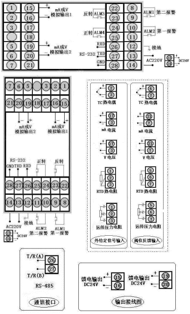 通訊方式RS485,輸出方式為繼電器輸出,PV輸入類型為4~20 mA,SV輸入類型為4~20 mA,D一報(bào)警為下限報(bào)警,D二報(bào)警為上限報(bào)警,DC24V饋電輸出,DC24V供電。