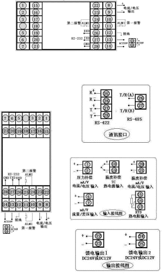 帶補償輸入,通訊方式RS-232,輸出方式為繼電器輸出,輸入類型為D一路0~10 mA,D二路1~5V,D一報警為上限報警,D二報警為下限報警,單路DC24V饋電輸出,DC24V供電,豎表。